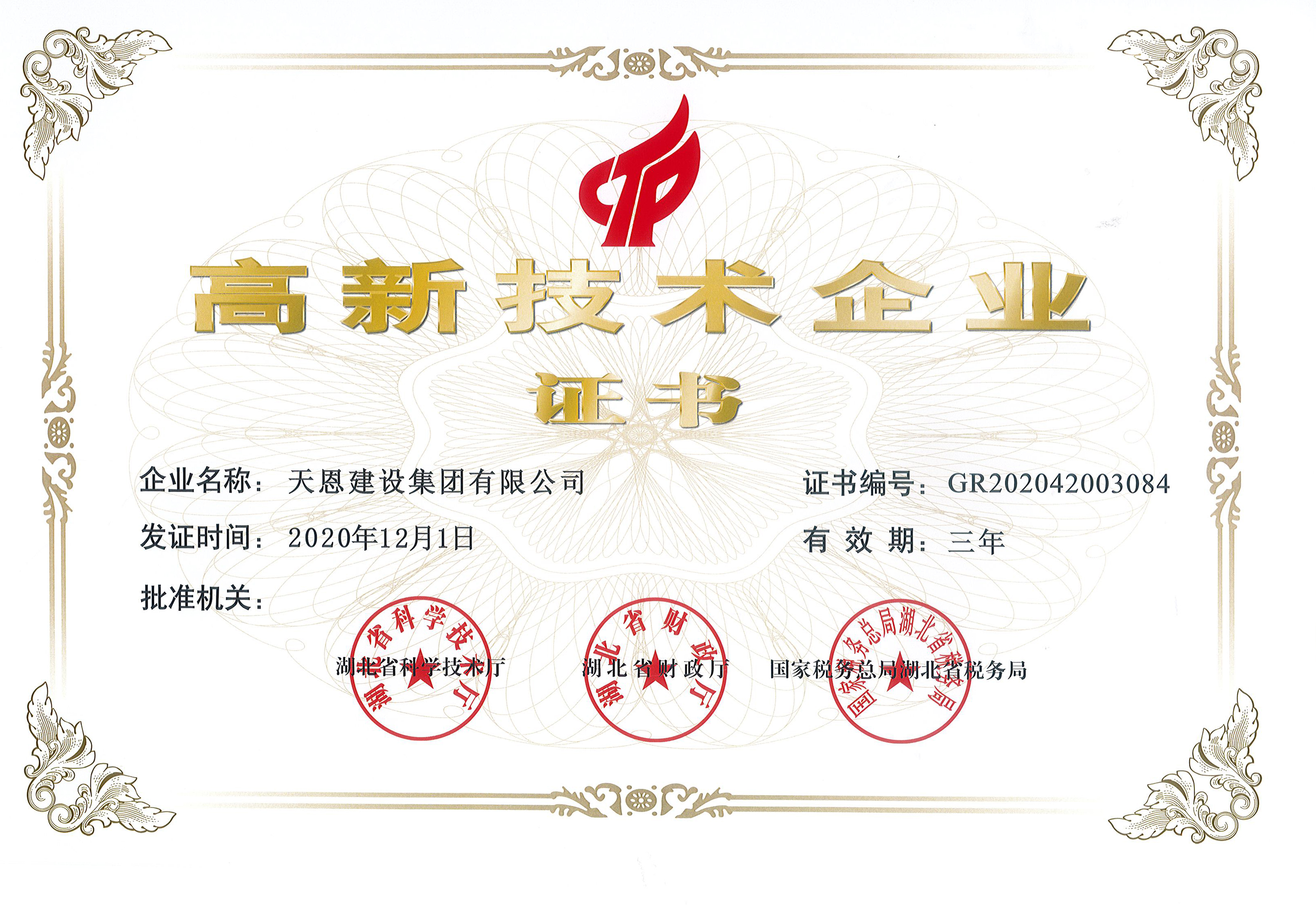 天恩建設集團有限公司憑借專業的研發隊伍、雄厚的技術實力、持續的創新能力、科學的企業管理,順利通過高新技術企業認定,榮獲由湖北省科學技術廳、湖北省財政廳、國家稅務總局湖北省稅務局聯合聯合頒發的“高新技術企業證書”。