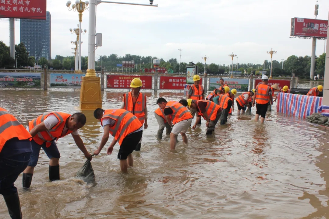 黨員干部沖鋒在前,員工齊心協力排澇。他們擼起袖子,卷起褲管,趟著齊膝深的水,冒雨組成“長龍”轉運沙包,堵缺口,阻溢水。